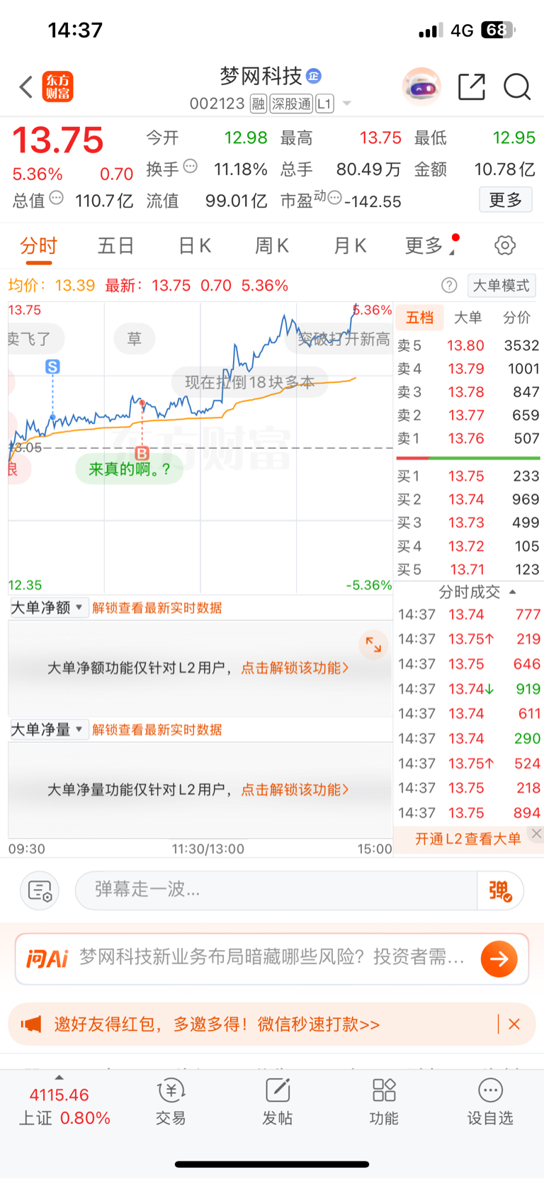 $梦网科技(SZ002123)$ 今天做了个反T