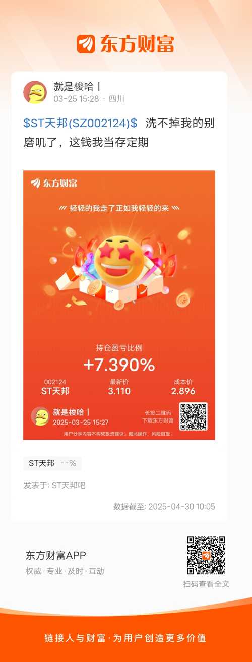$ST天邦(SZ002124)$  洗不掉我的别磨叽了,这钱我当存定期
