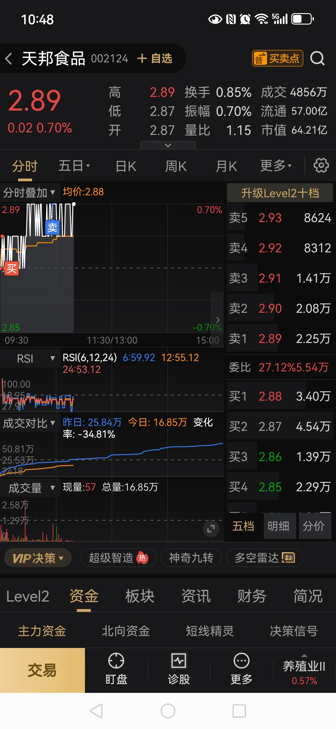 $天邦食品(SZ002124)$ 我错了!早上2.87买的,2.89卖了!不抢筹码了!你涨吧!再跌害我又要买回来