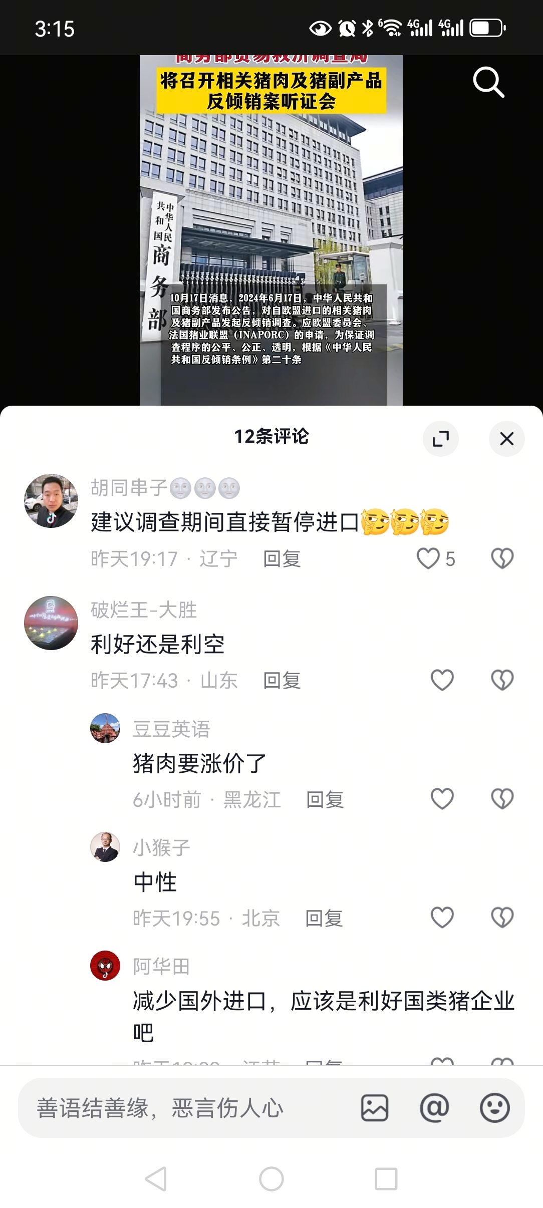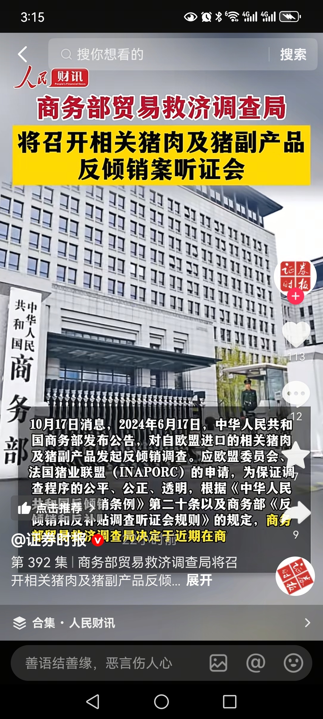 猪肉对欧盟的反倾销听证来了,利好猪肉板块。2025/10/18