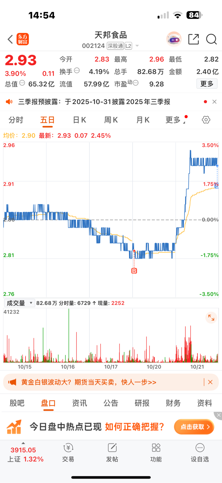$天邦食品(SZ002124)$ 偷肉了一天,下周再进了,让升一点打开上涨再进。