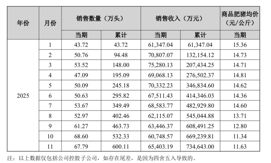 2025年1-11月,公司累计销售商品猪600万头(其中仔猪销售216万头),销售收入73.46亿元,销售均价14.95元/公斤。同比来看,销售数量增长10.13%,销售收入下降7.65%,销售均价下降16.70%。