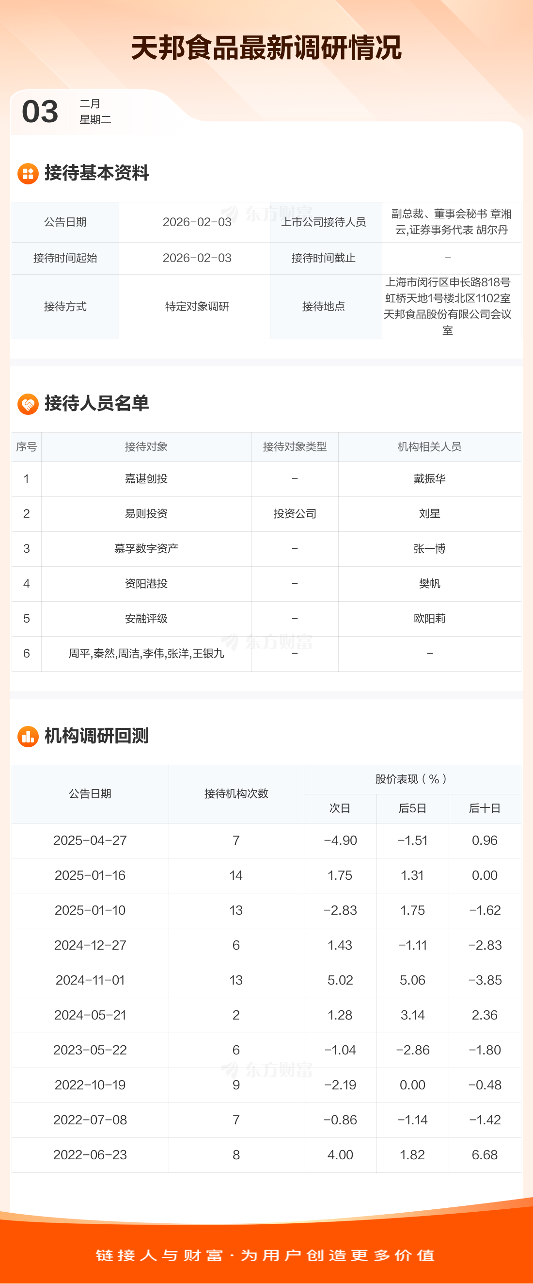 天邦食品2月3日公告称,2月3日接待嘉谌创投等6家机构调研。接待人员包括副总裁、董事会秘书 章湘云,证券事务代表 胡尔丹。