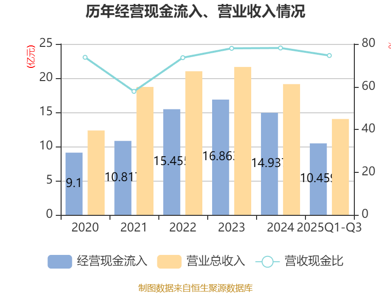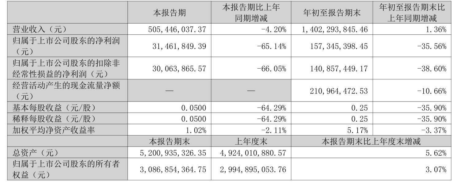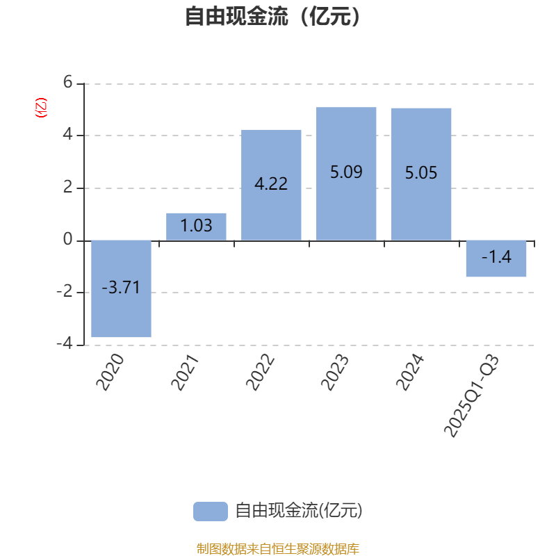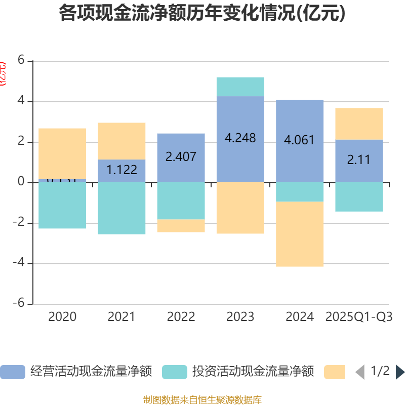 2025年前三季度,公司经营活动现金流净额为2.11亿元,同比下降10.66%;筹资活动现金流净额1.55亿元,同比增加5.05亿元;投资活动现金流净额-1.45亿元,上年同期为-6111.67万元。