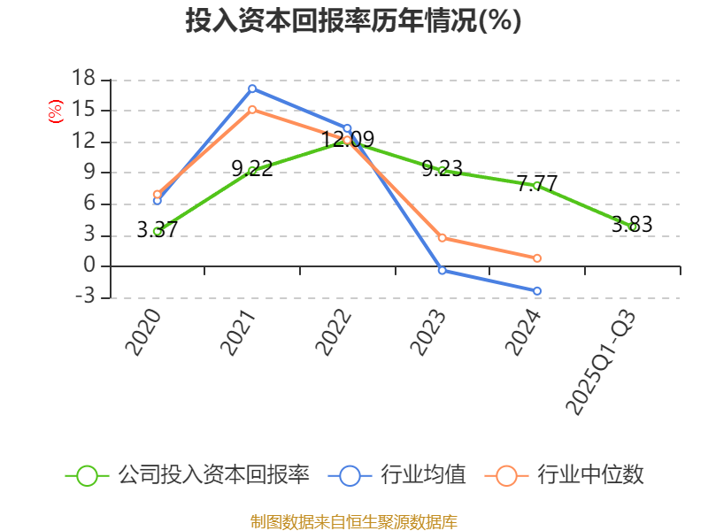 盈利能力方面, 2025年前三季度公司加权平均净资产收益率为5.17%,同比下降3.37个百分点。公司2025年前三季度投入资本回报率为3.83%,较上年同期下降2.3个百分点。
