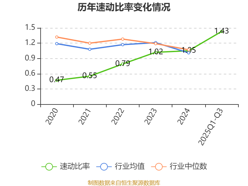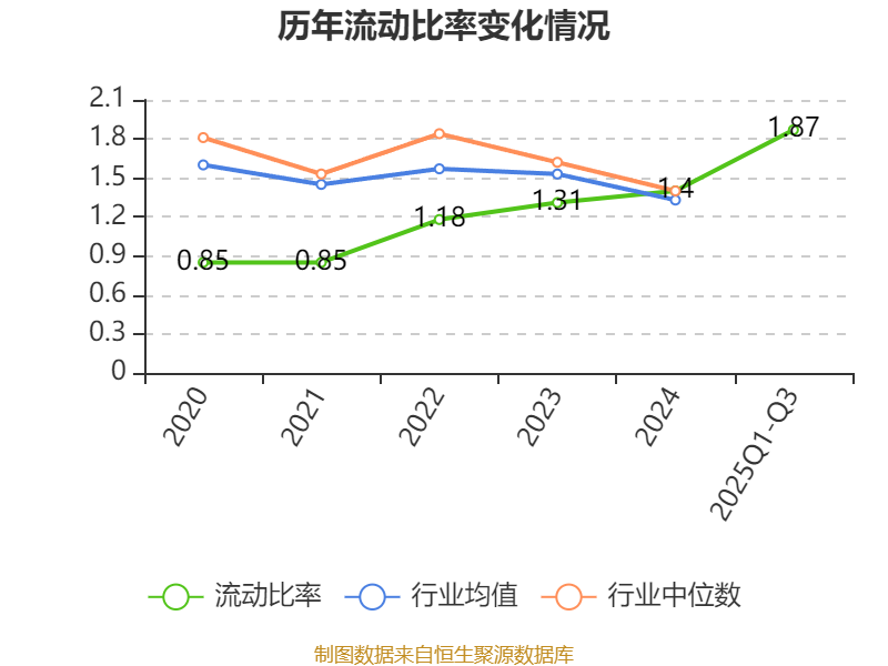 2025年前三季度,公司流动比率为1.87,速动比率为1.43。