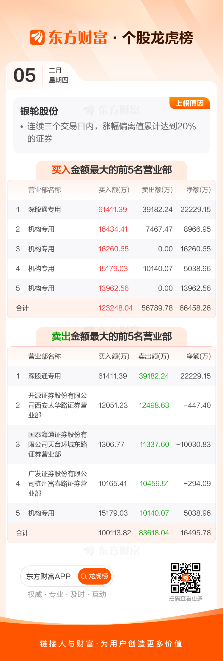 交易所2026年2月5日公布的交易公开信息显示,银轮股份因成为连续三个交易日内,涨幅偏离值累计达到20%的证券上榜。银轮股份当日收报44.4元,涨跌幅2.75%,换手率9.26%,成交额31.99亿。异常期间2月3日至2月5日,期间涨幅24.33%,累计偏离值22.99%,区间成交额71.82亿。