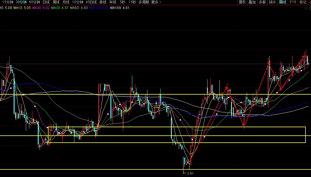 30分钟均线上升浪已经走完,下面是日线级别的调整,到4.1-4.2的概率极大。极端情况甚至低于4块,毕竟要休市那么多天
