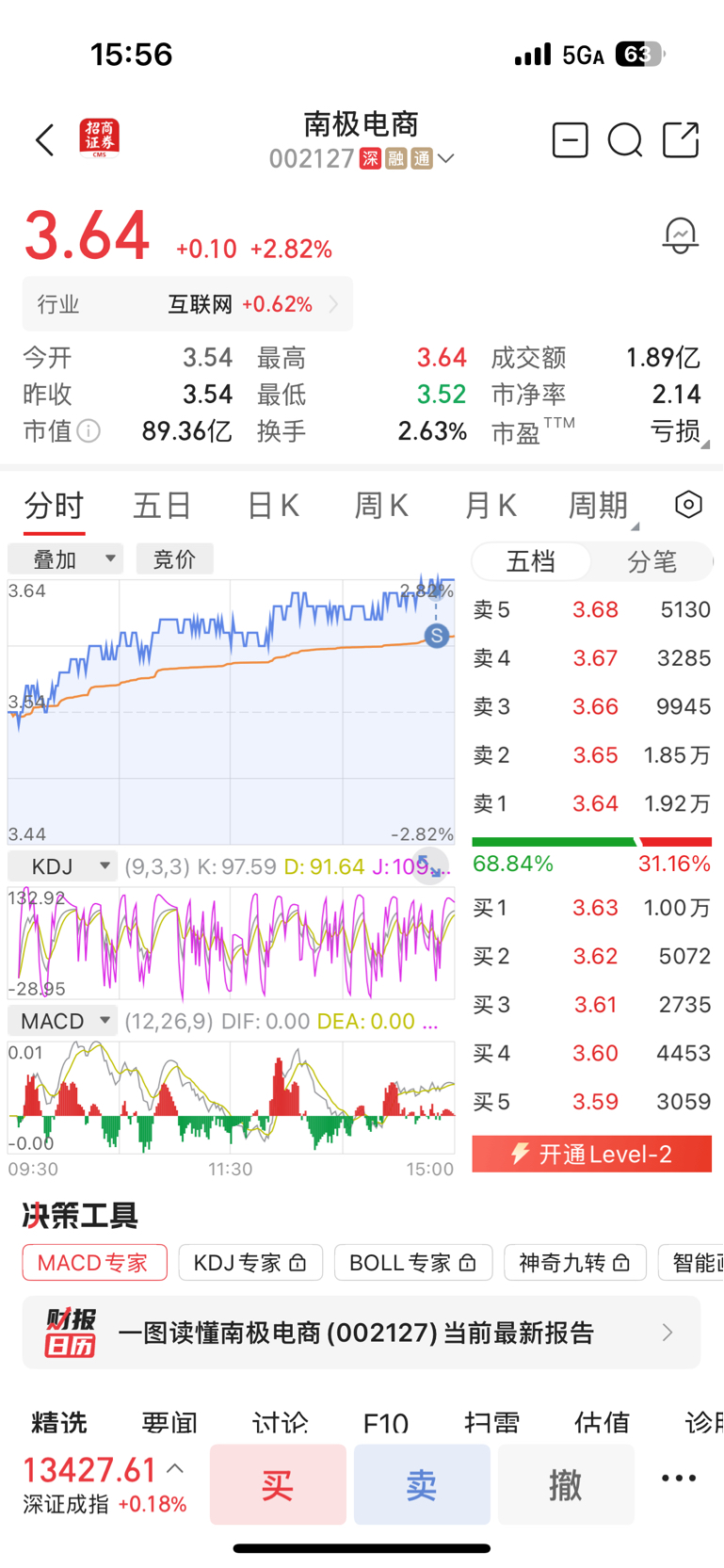 $南极电商(SZ002127)$ T在最高点 364,明早低开接回来!反复做!