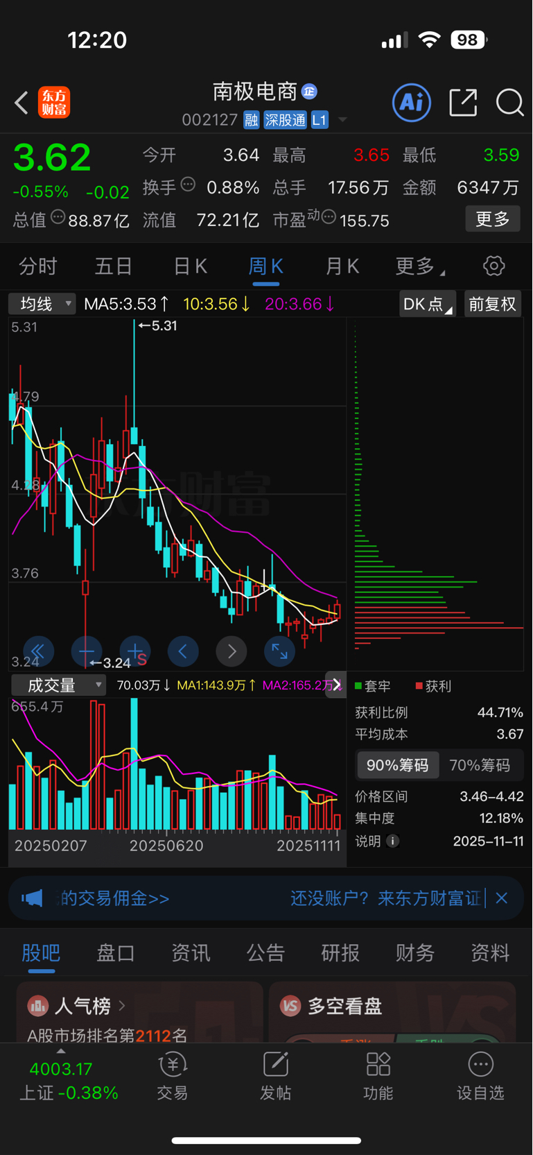 $南极电商(SZ002127)$ 突破不了4元,这筹码只能下移(做T),很难合力拉升!