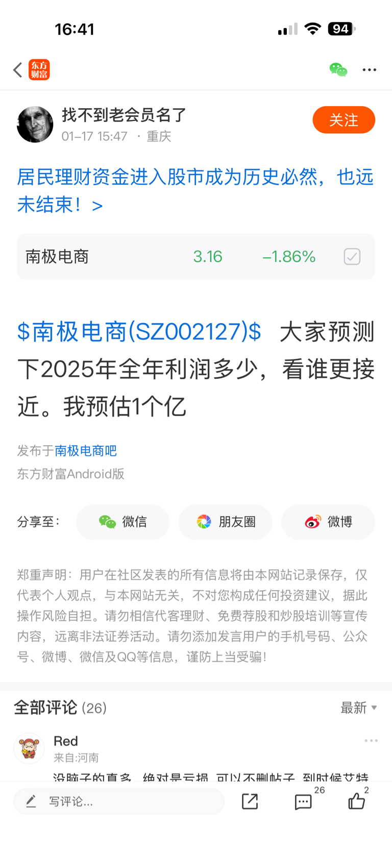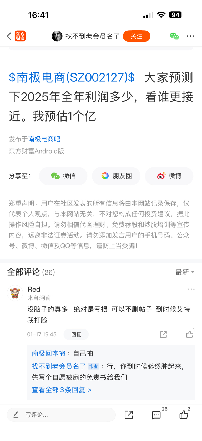 温馨提示: 1.根据《证券法》规定,禁止编造、传播虚假信息或者误导性信息,扰乱证券市场;2.用户在本社区发表的所有资料、言论等仅代表个人观点,与本网站立场无关,不对您构成任何投资建议。用户应基于自己的独立判断,自行决定证券投资并承担相应风险。《东方财富社区管理规定》
