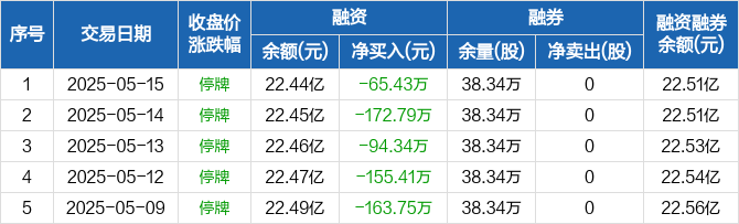 融资方面,当日融资买入0元,融资偿还65.43万元,融资净偿还65.43万元,连续9日净偿还累计3939.08万元。融券方面,融券卖出0股,融券偿还0股,融券余量38.34万股,融券余额684.37万元。融资融券余额合计22.51亿元。