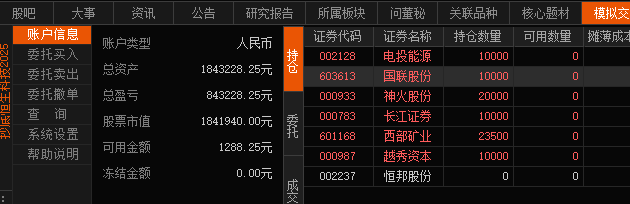 今天操作纪要,昨天全仓持有002128电投能源和603613国联股份,今天上午电投和国联电投大幅冲高,卖出后,新进西部矿业,券商,越秀和神火,新买的全是绿盘或者是平盘的股票,本人不喜欢追高买货,只喜欢买别人不要的,以下是模拟操作,交流一下,没别的意思