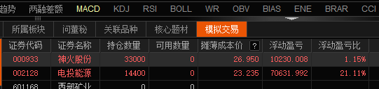 模拟操作。今天27.65卖出.昨天买进的02128后,反手低位27.19买回002128,以为还会下跌,不跌就找替补26.90买进绿盘的000933