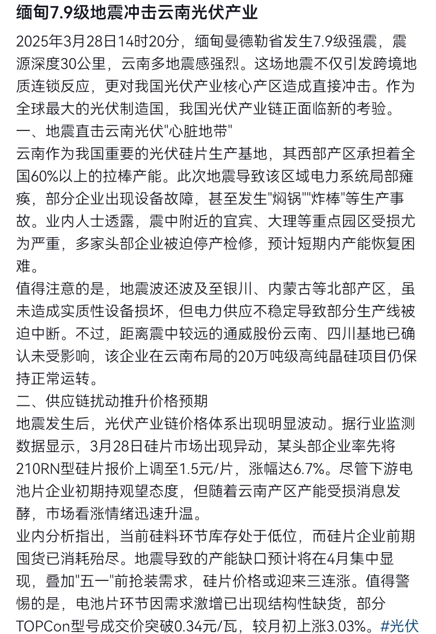 $TCL中环(SZ002129)$ tcl在内蒙古,影响不算大,通威隆基等恐怕要检修了,那么大型的生产厂房设备估计停产一个月了,本来光伏抢装就在这两个月,这下大概1/4的产能没办法满足了。
