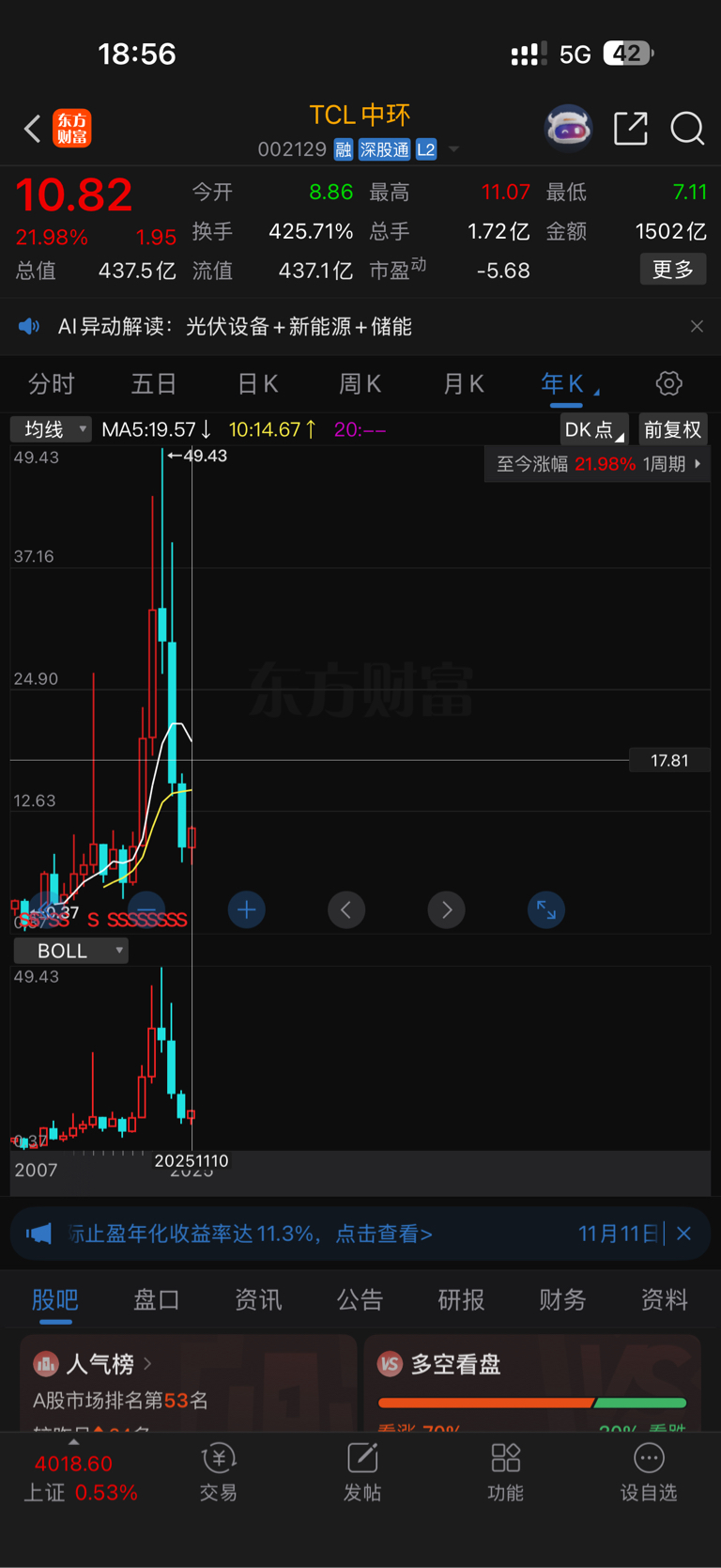 $TCL中环(SZ002129)$ 兄弟们,打开年k线你才知道,这个位置有多低,等于没涨,底部回弹才20个点,还有20个点的反弹