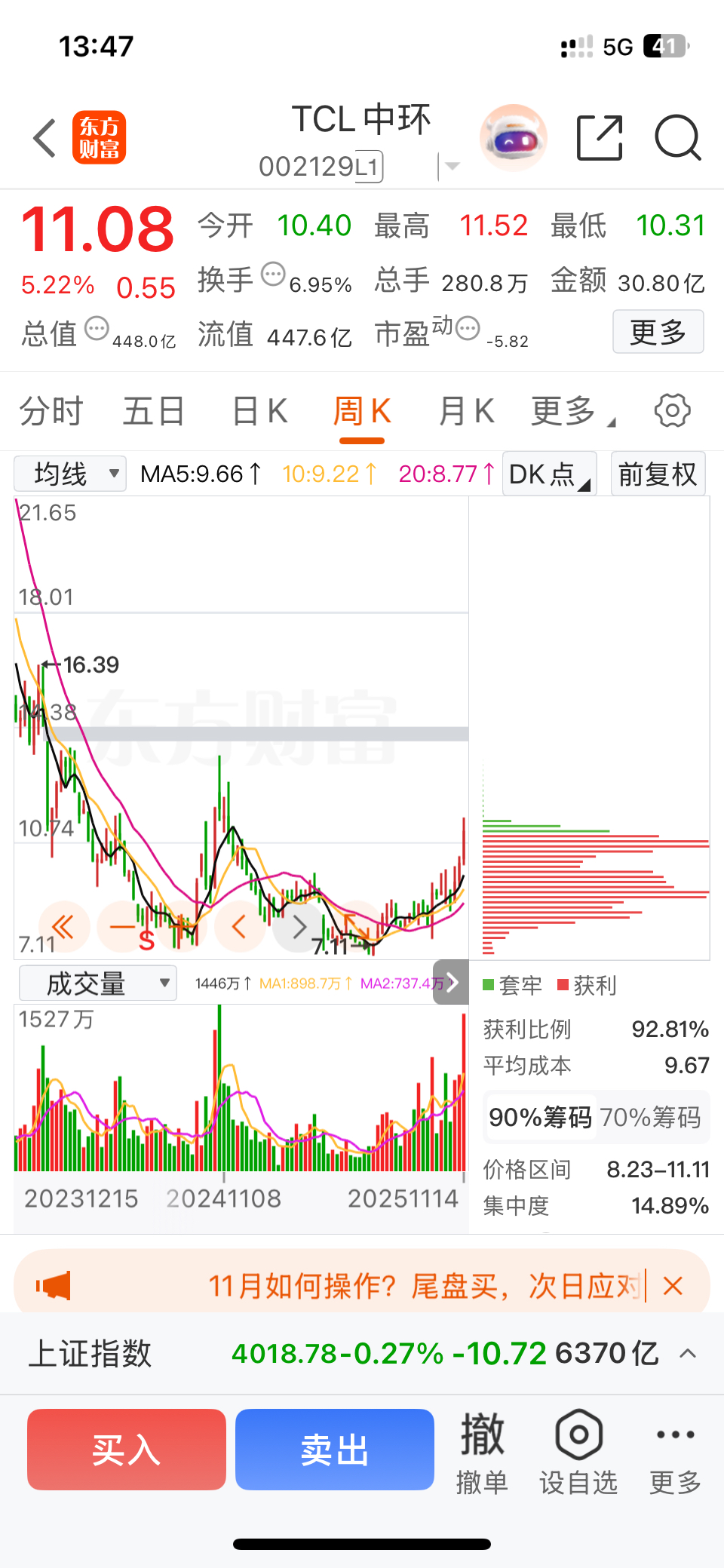 $TCL中环(SZ002129)$ 从筹码分布来看,当前筹码分布均匀,各价位持仓稳定