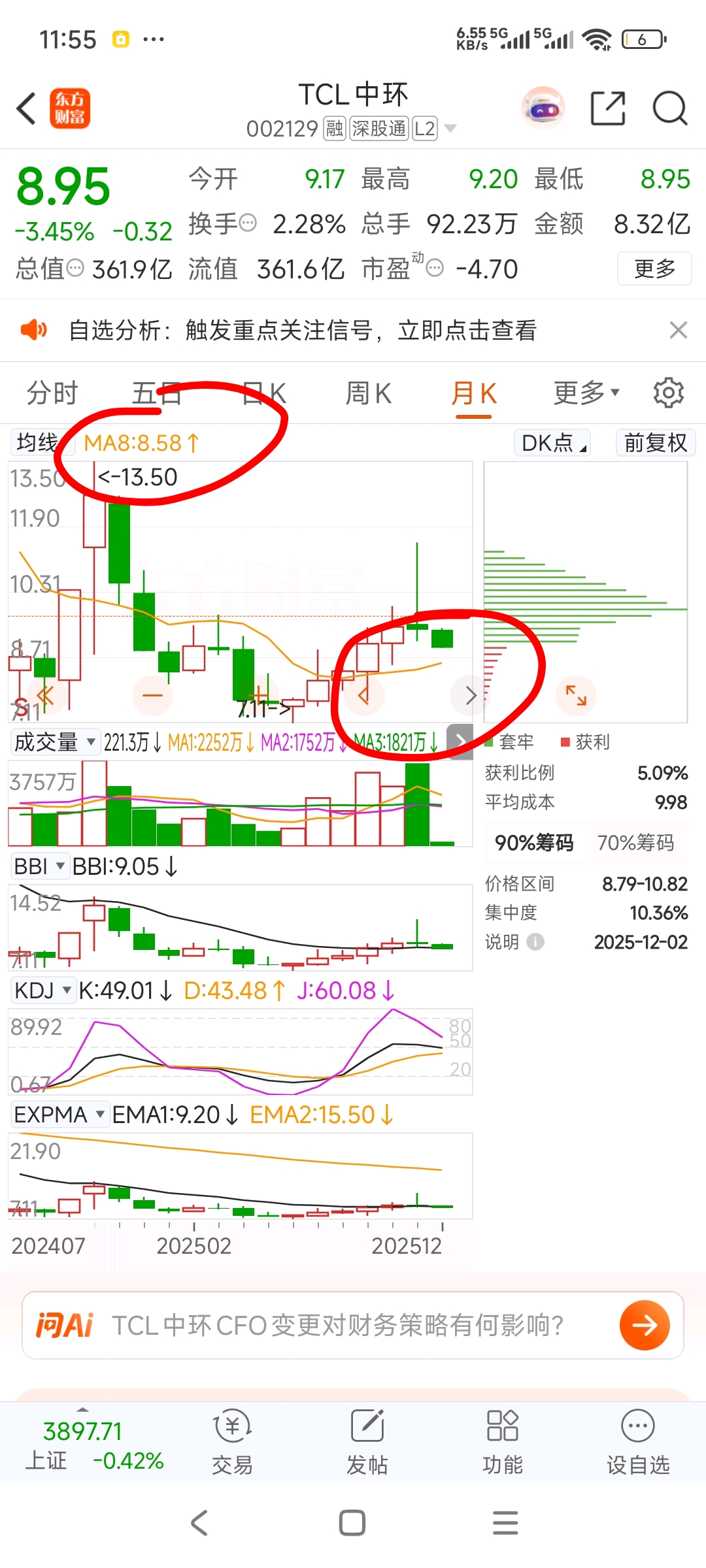 各个科技股的回调极限也就是八月线,碰到就结束回调,所以TCL中环的极限也就是8.