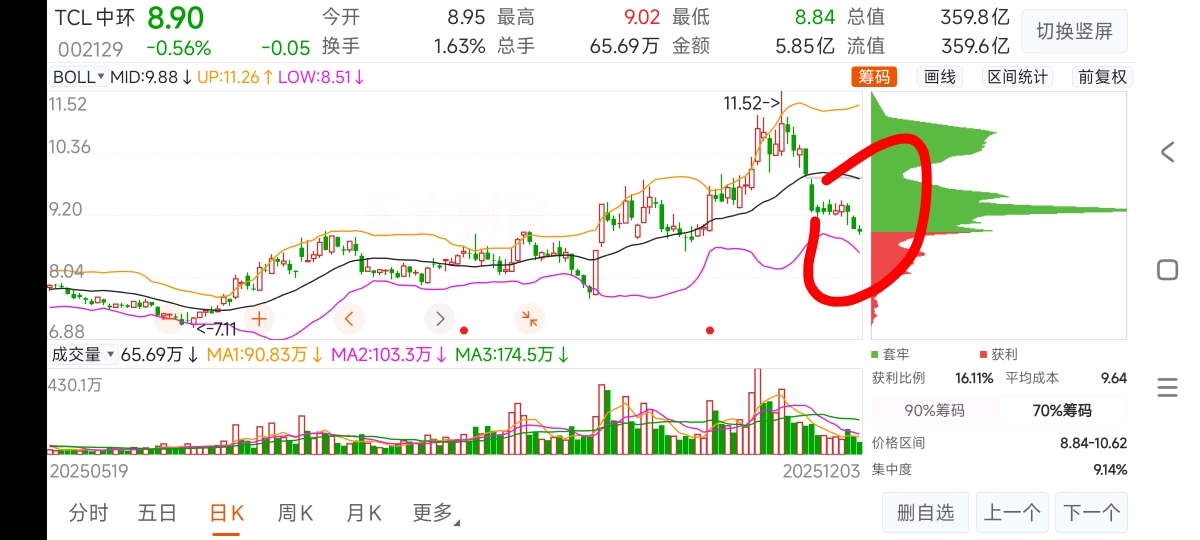 $TCL中环(SZ002129)$ 日k及120级别问题boll线,在大跌情况下,布林线依旧拐头向下,意味着日线急需一个阳线来将布林线收窄,而从120分钟布林线来看,下午的极速拉升让120分钟级别布林线开始收窄,这是好现象,等待下轨位置博弈。