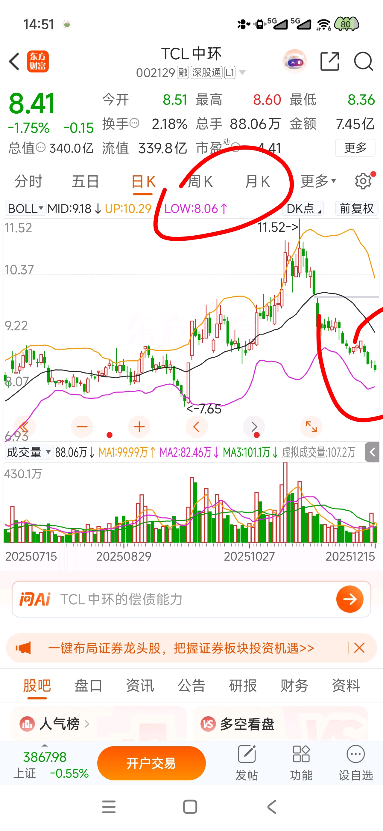 $TCL中环(SZ002129)$ 阶段性底部不远了,关注布林线下轨,长线坚定看多