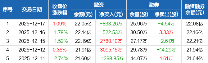 TCL中环融资融券信息显示,2025年12月17日融资净偿还833.26万元;融资余额22.05亿元,较前一日下降0.38%。