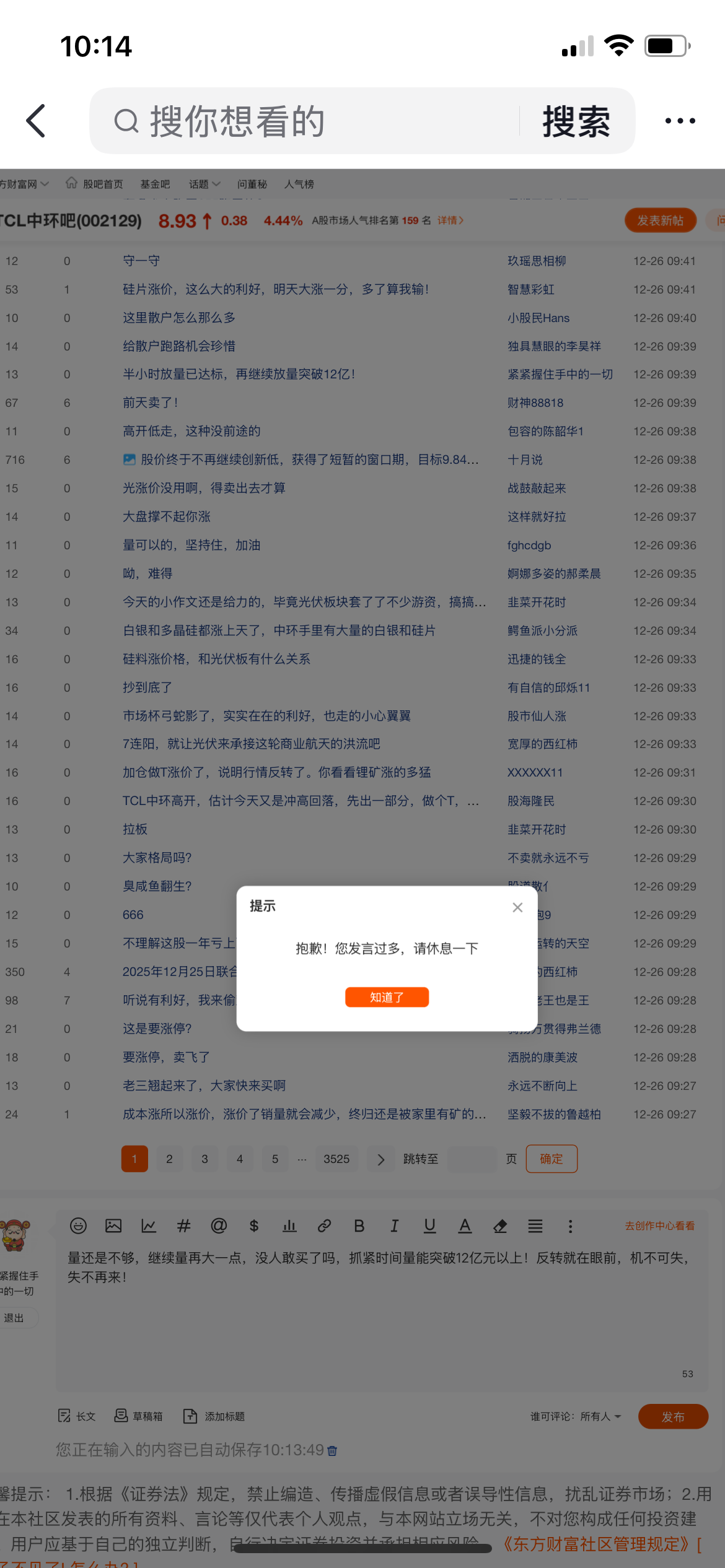 温馨提示: 1.根据《证券法》规定,禁止编造、传播虚假信息或者误导性信息,扰乱证券市场;2.用户在本社区发表的所有资料、言论等仅代表个人观点,与本网站立场无关,不对您构成任何投资建议。用户应基于自己的独立判断,自行决定证券投资并承担相应风险。《东方财富社区管理规定》