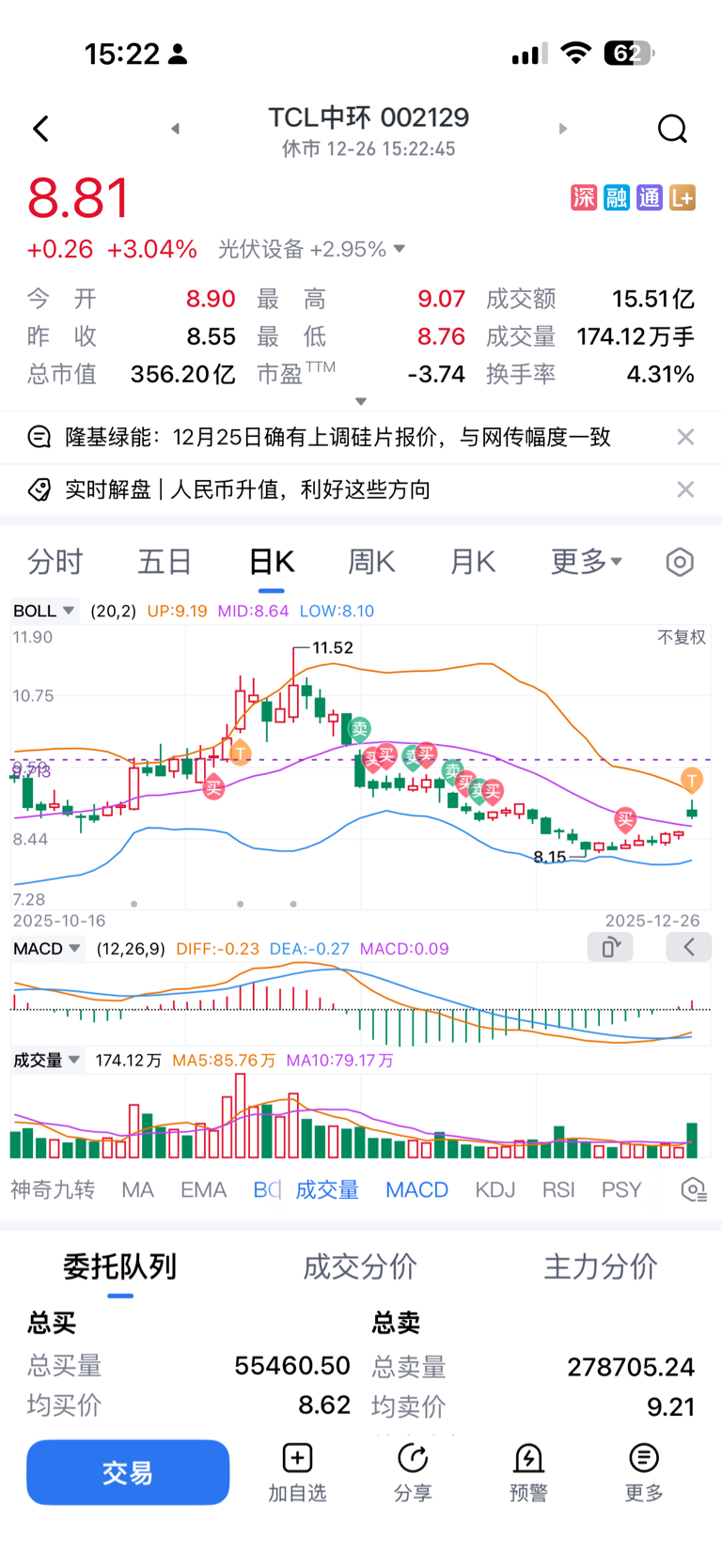 $TCL中环(SZ002129)$ 今天大盘突然跳崖,我赶紧操作.在观察中发现是假摔,然后继续把卖出的买入.盘后光伏继续出利好.今天量能充足,大家对价格感到满意.持续看多.
