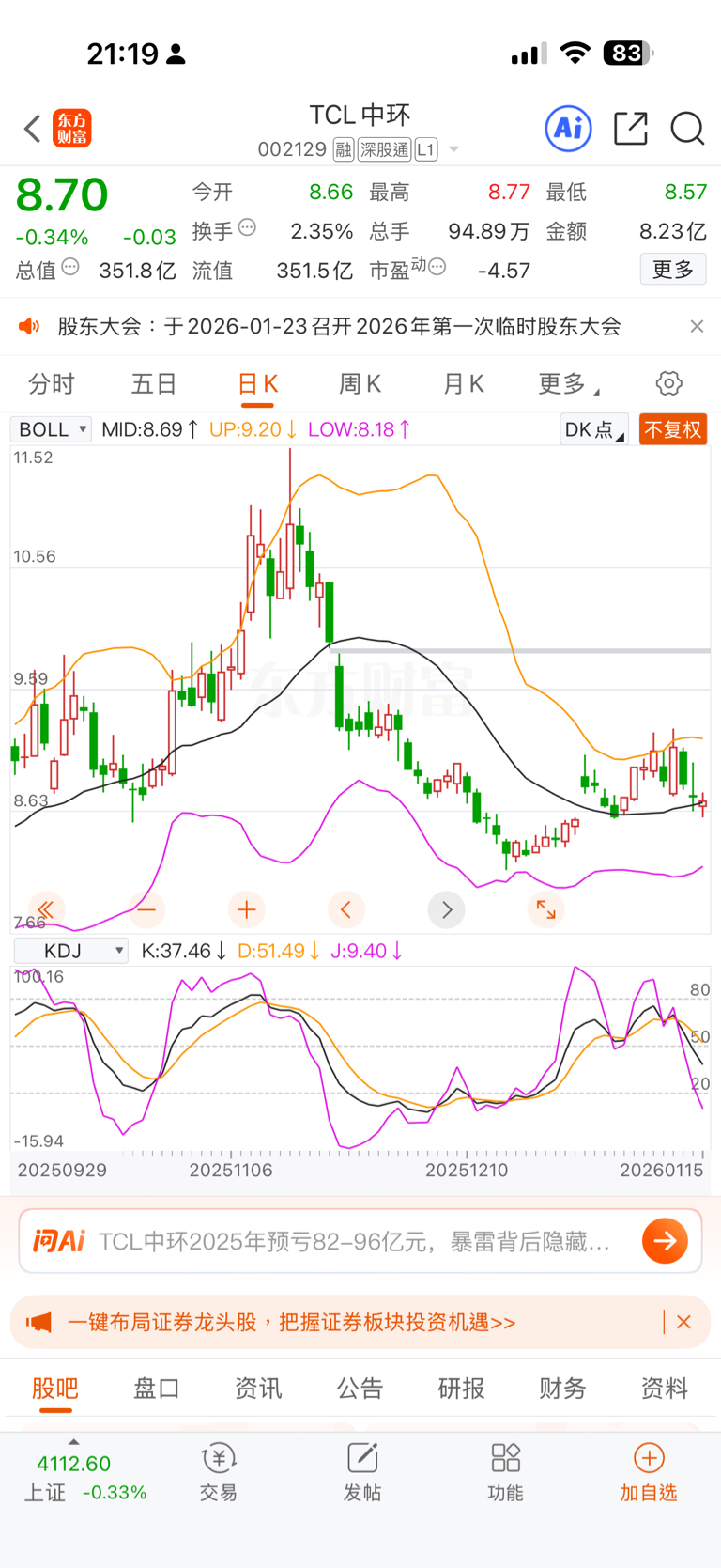 $TCL中环(SZ002129)$ 中环今天围绕着20日线震荡.也是关键的一天.假如明天向上跳空高开一点,那么就可以加仓看多,平开或者低开往下走,那么就奔着下轨去的.短期一周就8.19处看支撑了.