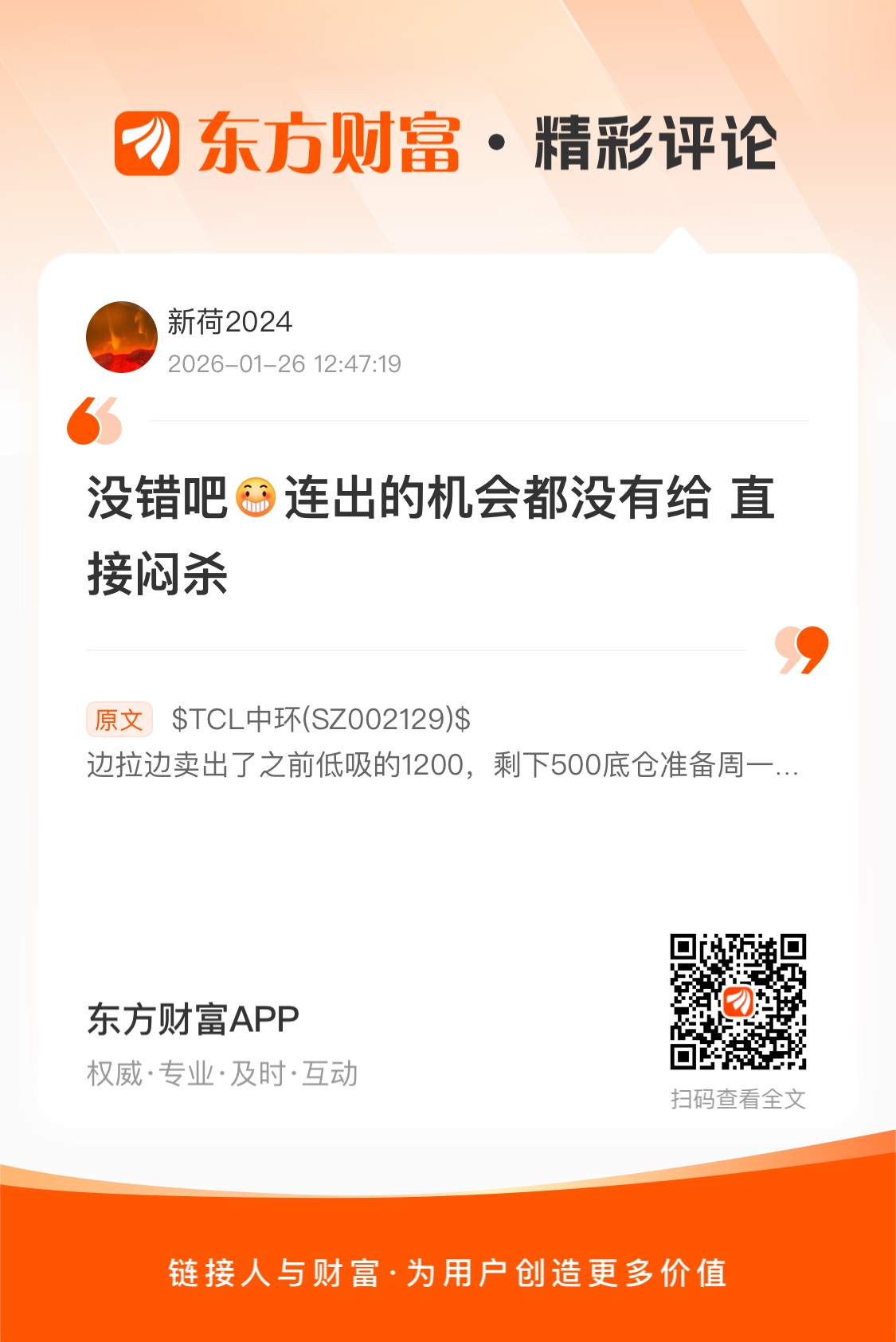 温馨提示: 1.根据《证券法》规定,禁止编造、传播虚假信息或者误导性信息,扰乱证券市场;2.用户在本社区发表的所有资料、言论等仅代表个人观点,与本网站立场无关,不对您构成任何投资建议。用户应基于自己的独立判断,自行决定证券投资并承担相应风险。《东方财富社区管理规定》