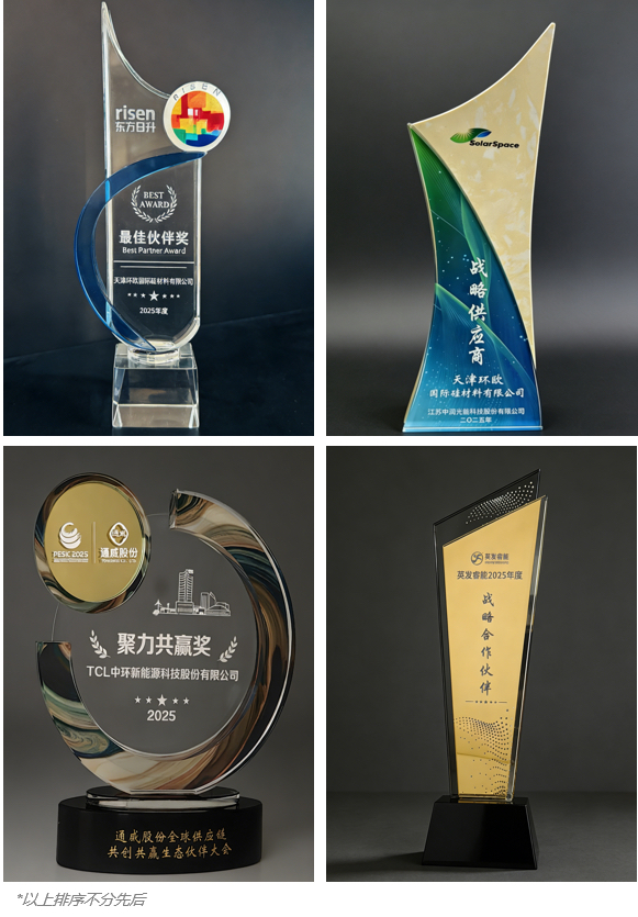 近日,TCL 中环接连收获核心客户的多重权威肯定,以高品质的硅片产品, 成功摘得2025年度东方日升“最佳伙伴奖”,中润光能“战略供应商”,通威股份“聚力共赢奖”,并正式当选英发睿能“战略合作伙伴”。