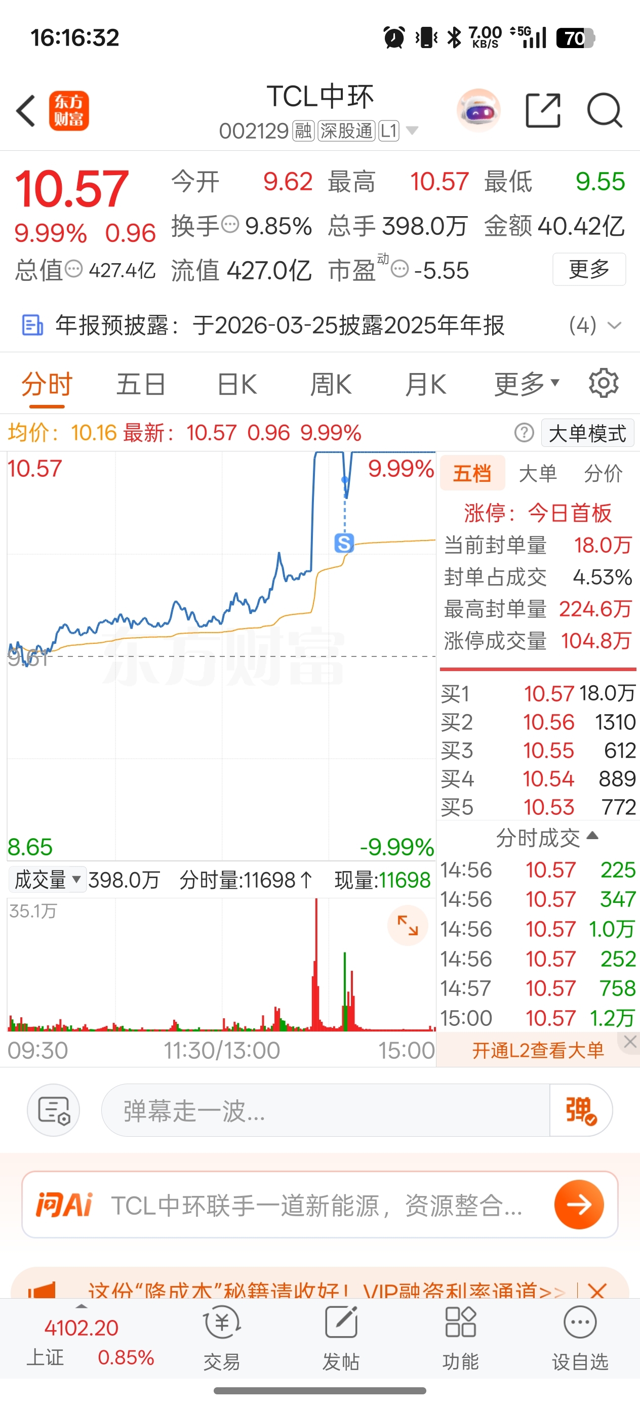 $TCL中环(SZ002129)$ 第一次挂条件单。开板条件单为什么不在涨停价成交,或者10.56成交?求解答。