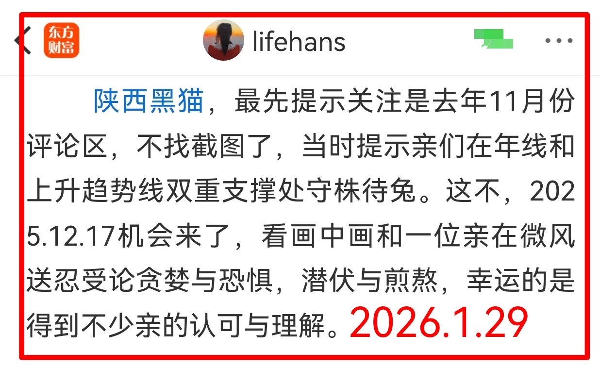 陕西黑猫最早提示关注是去年11月份评论区,2026.1.29当天又同时和TCL中环一起分享,分享前一晚上还和好多位亲在微风送信单独讨论了,这里不方便截图,探讨过的亲看到可以为我作证。