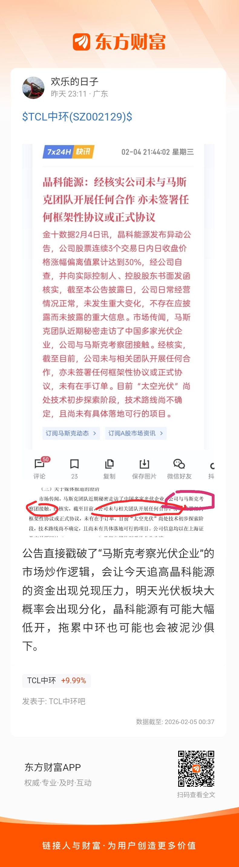 公告直接戳破了“马斯克考察光伏企业”的市场炒作逻辑,会让今天追高晶科能源的资金出现兑现压力,明天光伏板块大概率会出现分化,晶科能源有可能大幅低开,拖累中环也可能也会被泥沙俱下。