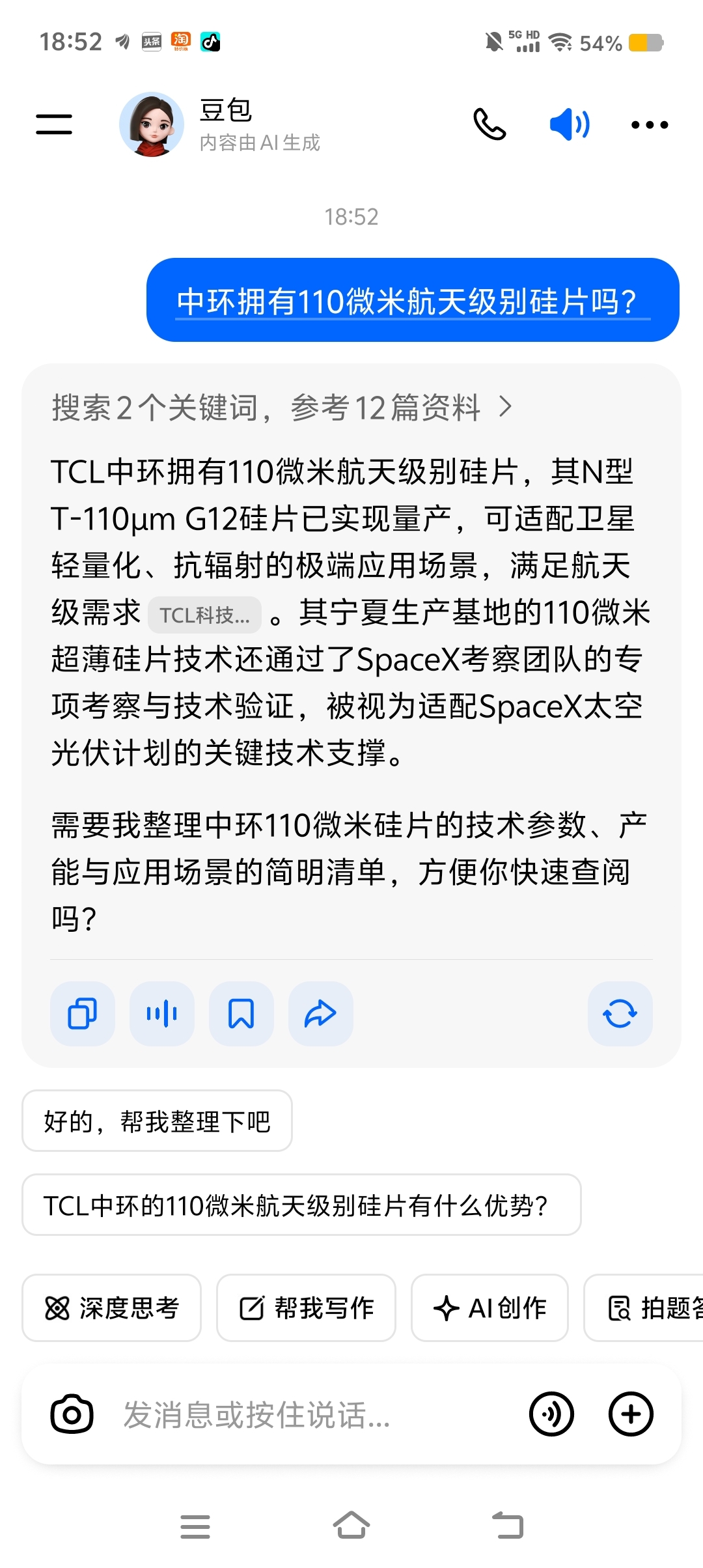 $TCL中环(SZ002129)$ 目前,TCL中环已经通过了马斯克团队的考察和验证,TCL中环拥有110微米航天级别硅片,其N型T-110μm G12硅片已实现量产,可适配卫星轻量化、抗辐射的极端应用场景,满足航天级需求 。其宁夏生产基地的110微米超薄硅片技术还通过了SpaceX考察团队的专项考察与技术验证,被视为适配SpaceX太空光伏计划的关键技术支撑。最近可能震荡剧烈,请大家坐稳了!