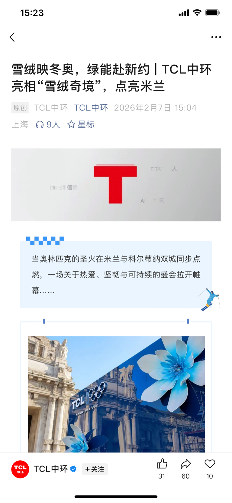 TCL中环亮相“雪绒奇境”,点亮米兰,是奥林匹克全球合作伙伴