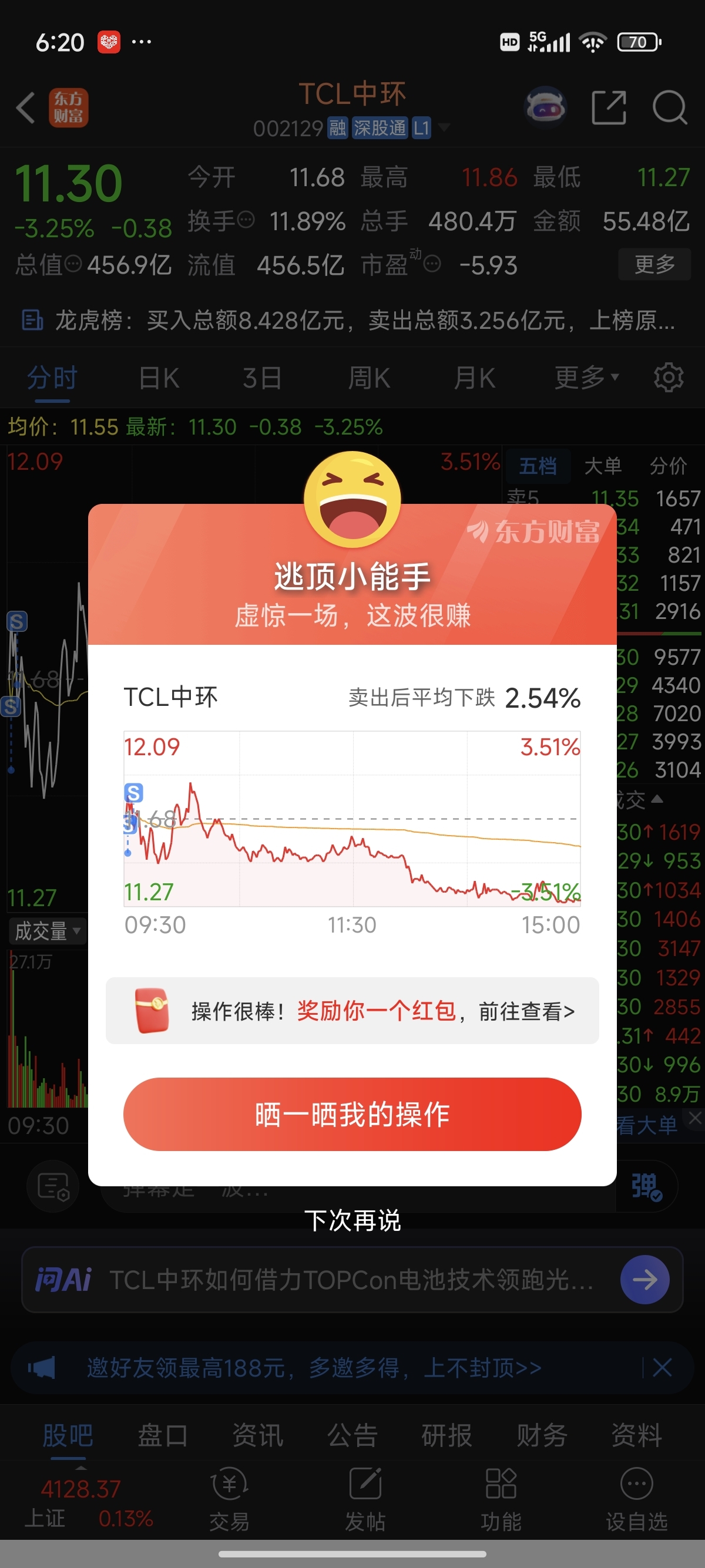 $TCL中环(SZ002129)$ 开盘不及预期,走人,明天看你五日线能不能企稳,太空光伏就这样结束了吗?