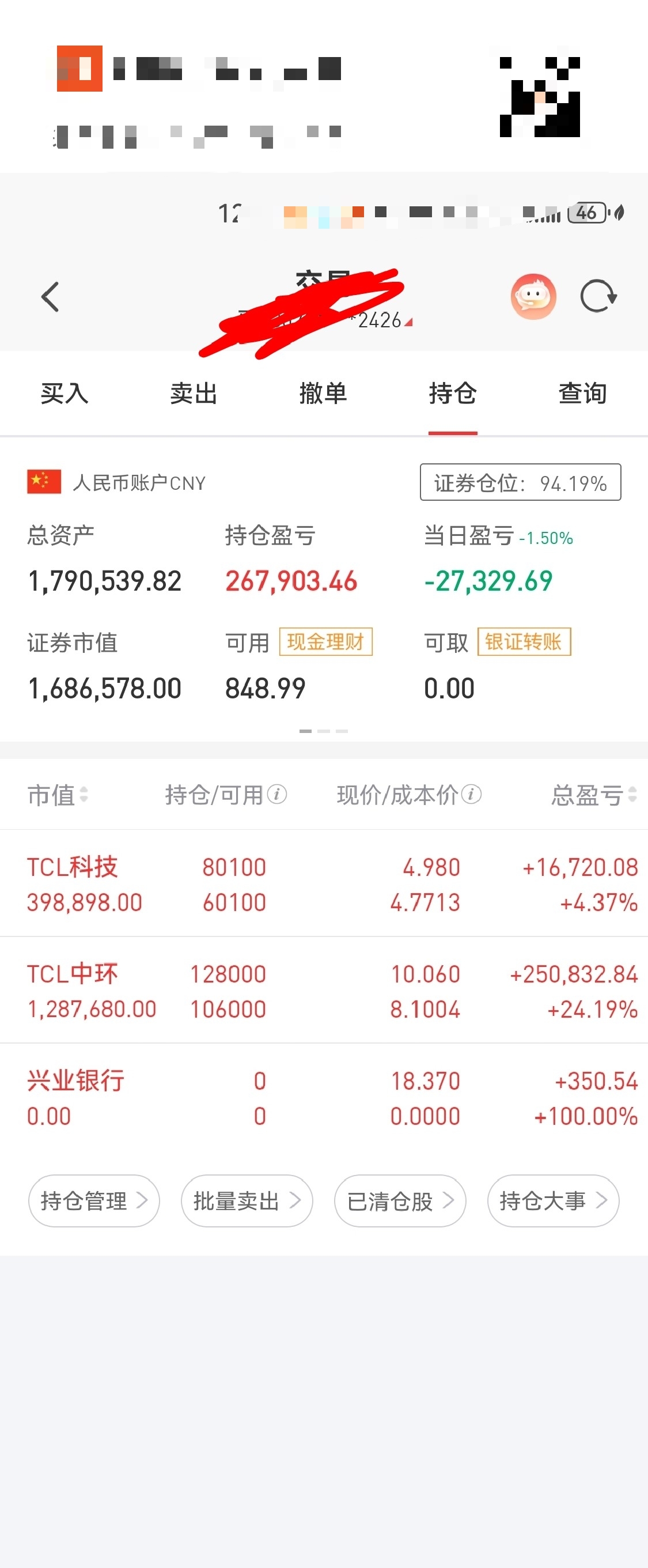 富贵险中求,清仓兴业,减仓TCL科技,补仓了一部分中环,剩余的10万左右,10.