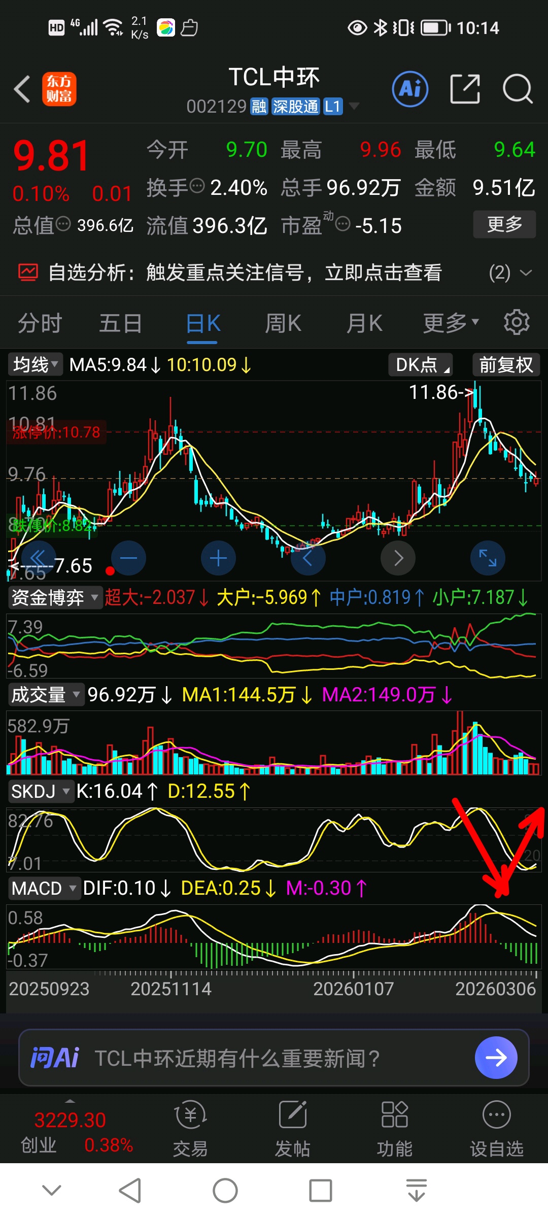 TCL中环,她会跌到哪里?我们并不知道,技术分析和交易策略是十字星后缩量,是一种波段阶段转折信号,回踩放量颈线位,8.5到9.6区间我们找机会就入场,被套就被套,也就是一个底部震荡区域,向上高位都有40元,我们就在11元到13元区间先部分仓位高抛低吸,赚价差,向下买着,套了就套了,向上就减仓,至于究竟怎么走?谁也分析不绝对,目前的k线,成交量,skdj和平台支撑缩量属于可能波段已经止跌,就算没止跌,也可能是日线低吸会出现反抽的阳线,然后再跌,8.5到9.6附近模糊精准买买买,可以正金字塔方式越跌越买,套了一点不可怕,她哪怕跌破8.5,到8元,7元,无非是底部砸了一个黄金坑,只要有资金买买买买就可以了,没有资金全仓被套,就不要看拉倒,说实在,你能借到钱,合法的不是高利贷都可以,说的太直白,太武断,主要是说确实出来混,这点风险都不接受,就不要买股票,存银行定期就吧…不要用高利贷哦?也不要用超过心态心理承受能力资金,当你的资金到了坐立不安,吃不好,睡不香时,反弹盈利务必减仓,减到没有心里压力为止就好了$TCL中环(SZ002129)$