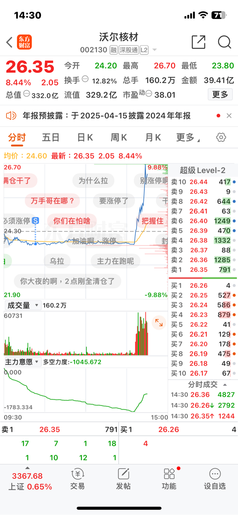 $沃尔核材(SZ002130)$ 有没有人可怜我一下。早上割肉亏了10个点走的。26.04的成本。我卖了就这样拉升嘛?