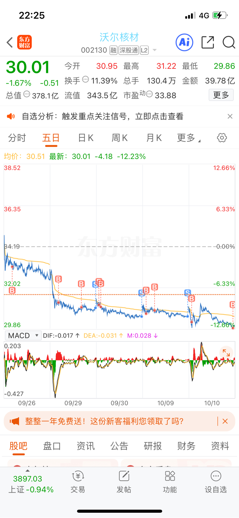 $沃尔核材(SZ002130)$ 每天开盘高开2个点,收盘-1个点以上,主力你厉害,你把我玩的很明白,我越补越亏
