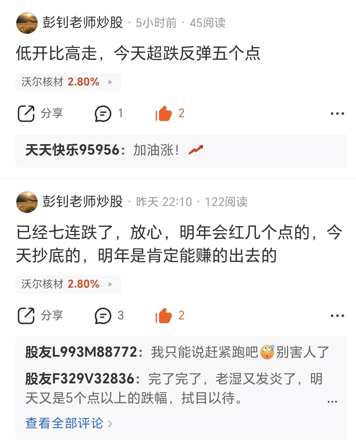 温馨提示: 1.根据《证券法》规定,禁止编造、传播虚假信息或者误导性信息,扰乱证券市场;2.用户在本社区发表的所有资料、言论等仅代表个人观点,与本网站立场无关,不对您构成任何投资建议。用户应基于自己的独立判断,自行决定证券投资并承担相应风险。《东方财富社区管理规定》