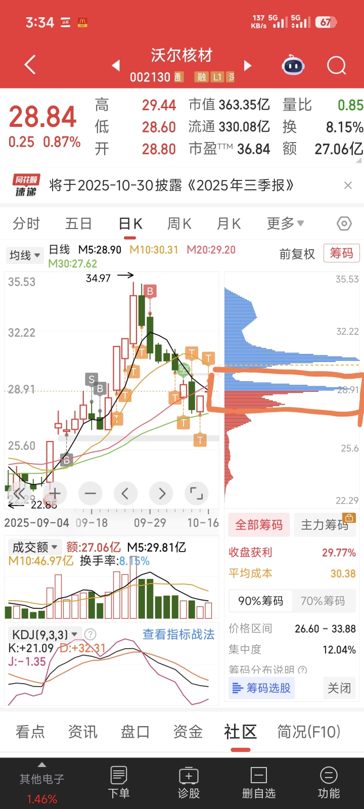 $沃尔核材(SZ002130)$ 这下午。。。好歹是红的吧明天估计还是继续缩量震荡,可能要把这个筹码峰做长