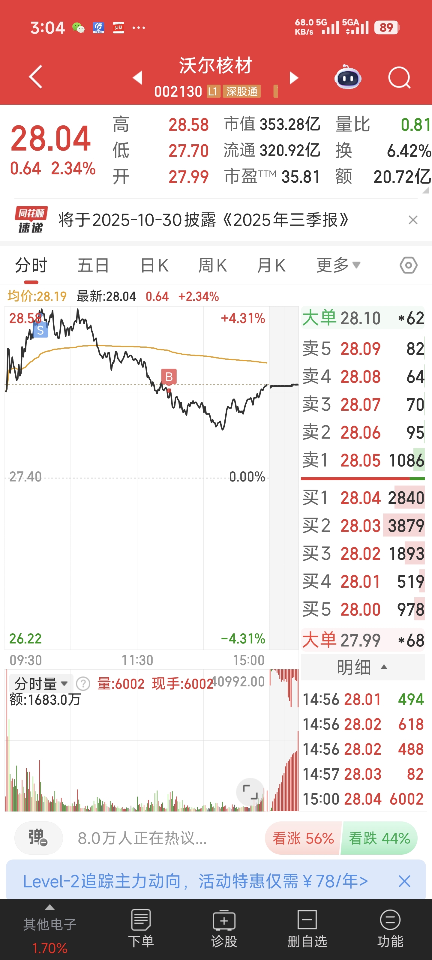 你牛大了我儿,给你的预期已经很低了,在这里面玩了这么久已经能想到你下午会跳水,到28感觉是稳住了就接回来了,没想到还能往下掉一个点,尾盘拉回来这一下明天又祸福难料了。