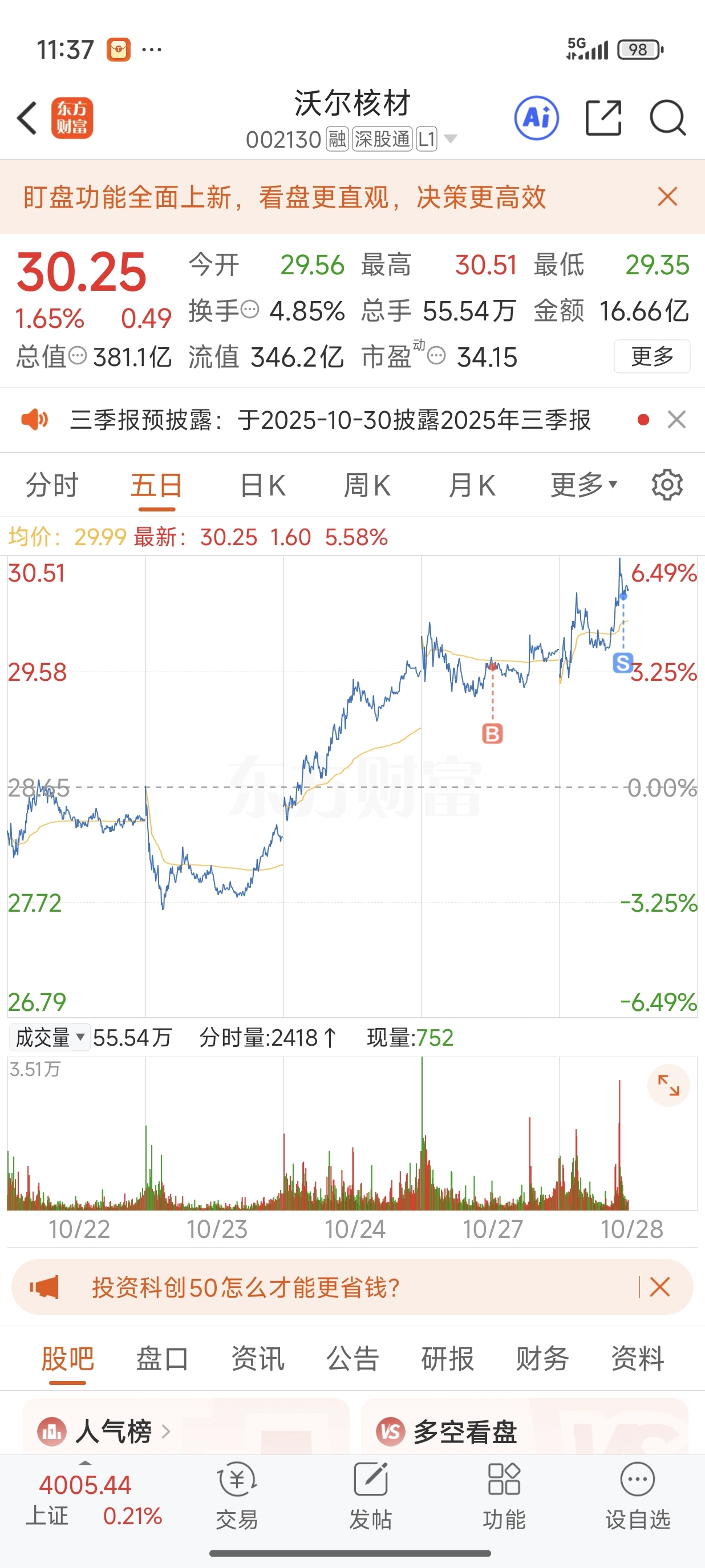 $沃尔核材(SZ002130)$ 车子太晃,30.19把我晃下去了