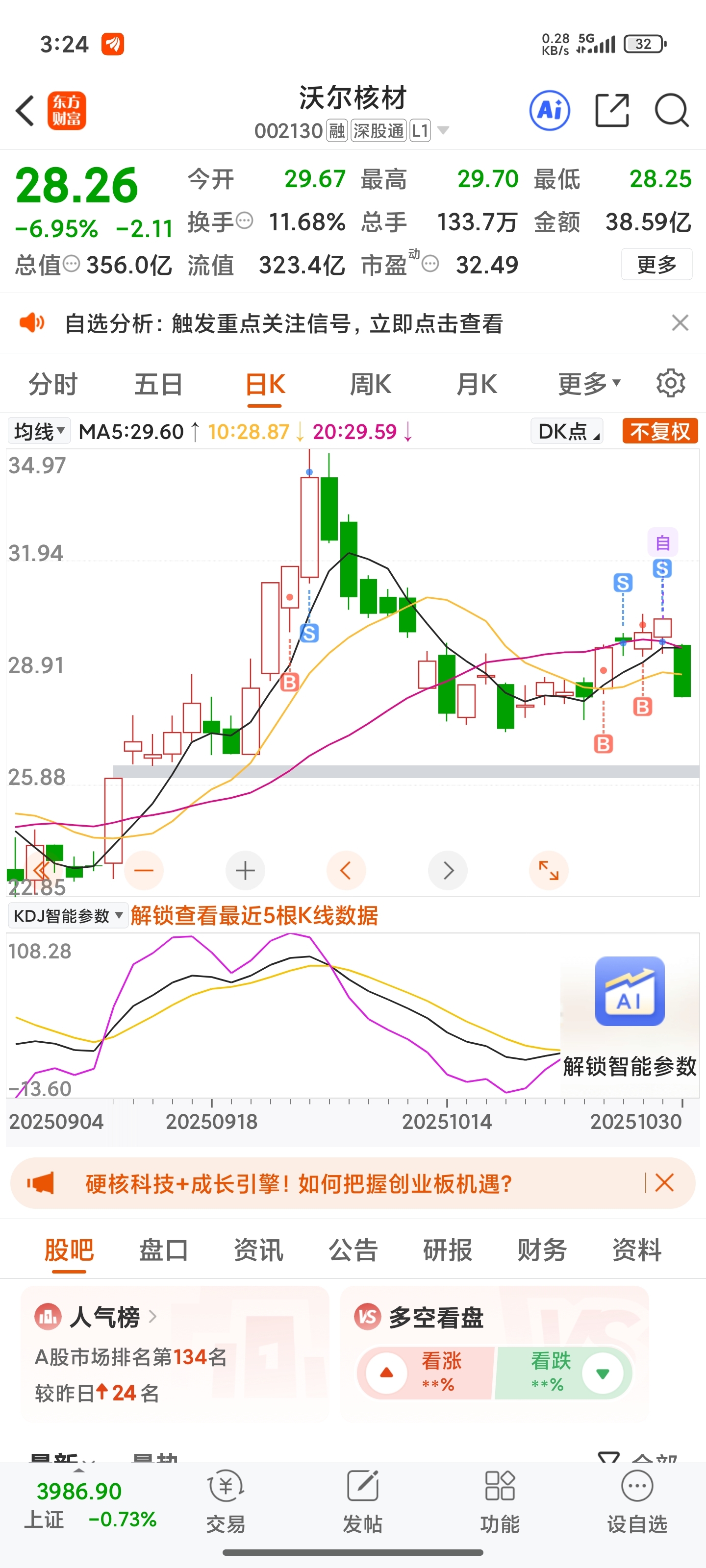$沃尔核材(SZ002130)$ 又是亏钱的一天