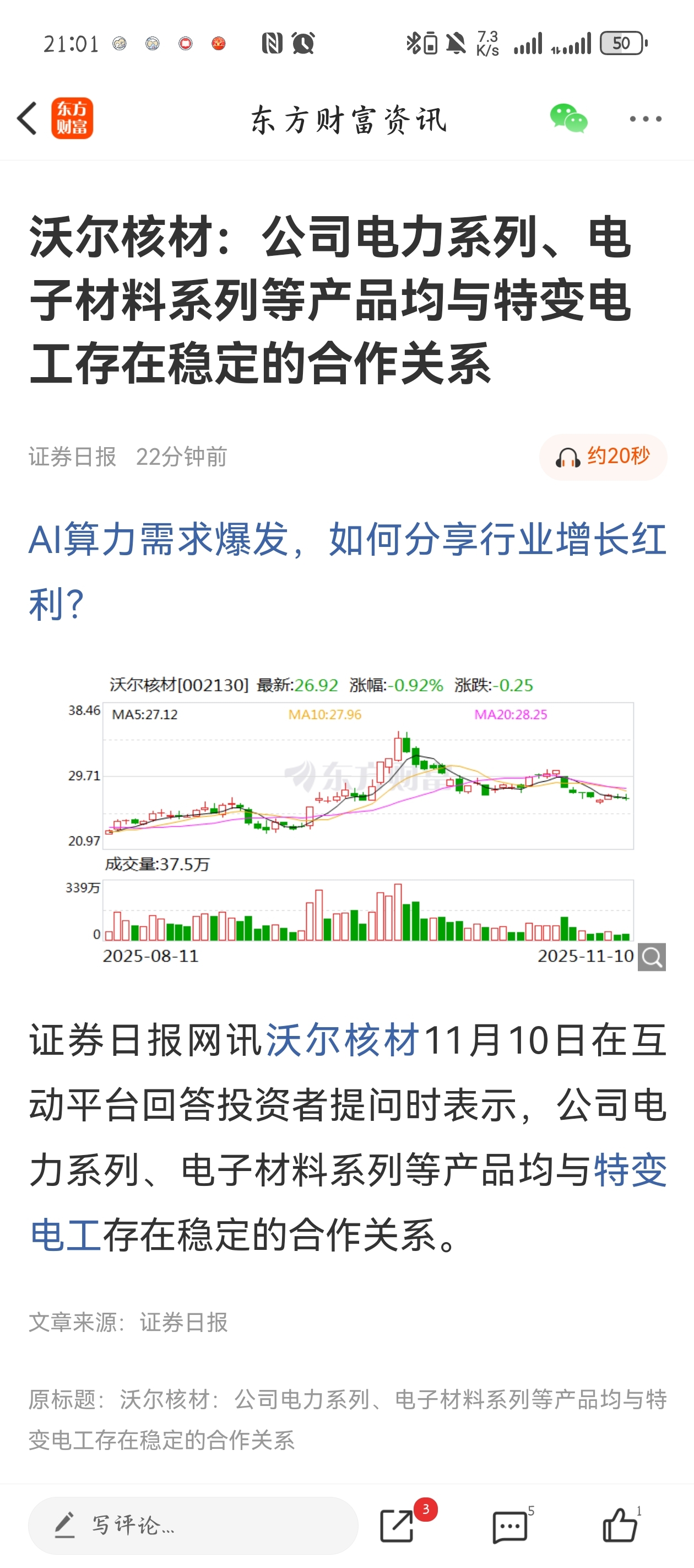 $沃尔核材(SZ002130)$ 明天电力设备调整,沃尔会跟随