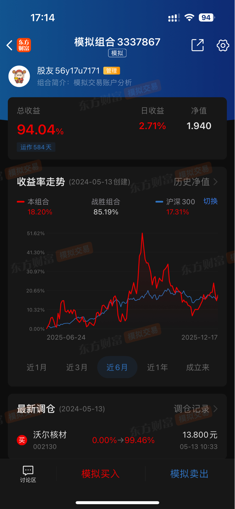 $沃尔核材(SZ002130)$ 去年五月份玩玩模拟的,涨幅快100%了。
