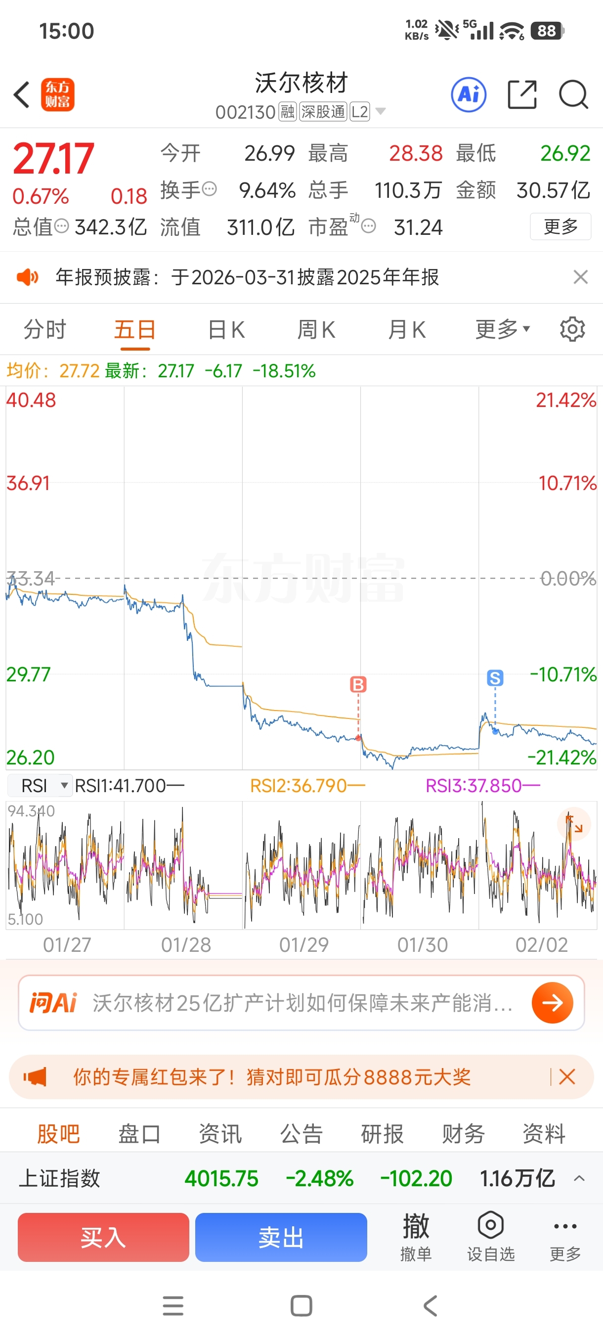 $沃尔核材(SZ002130)$ 小赚两个点不到跑路了。各位拜拜