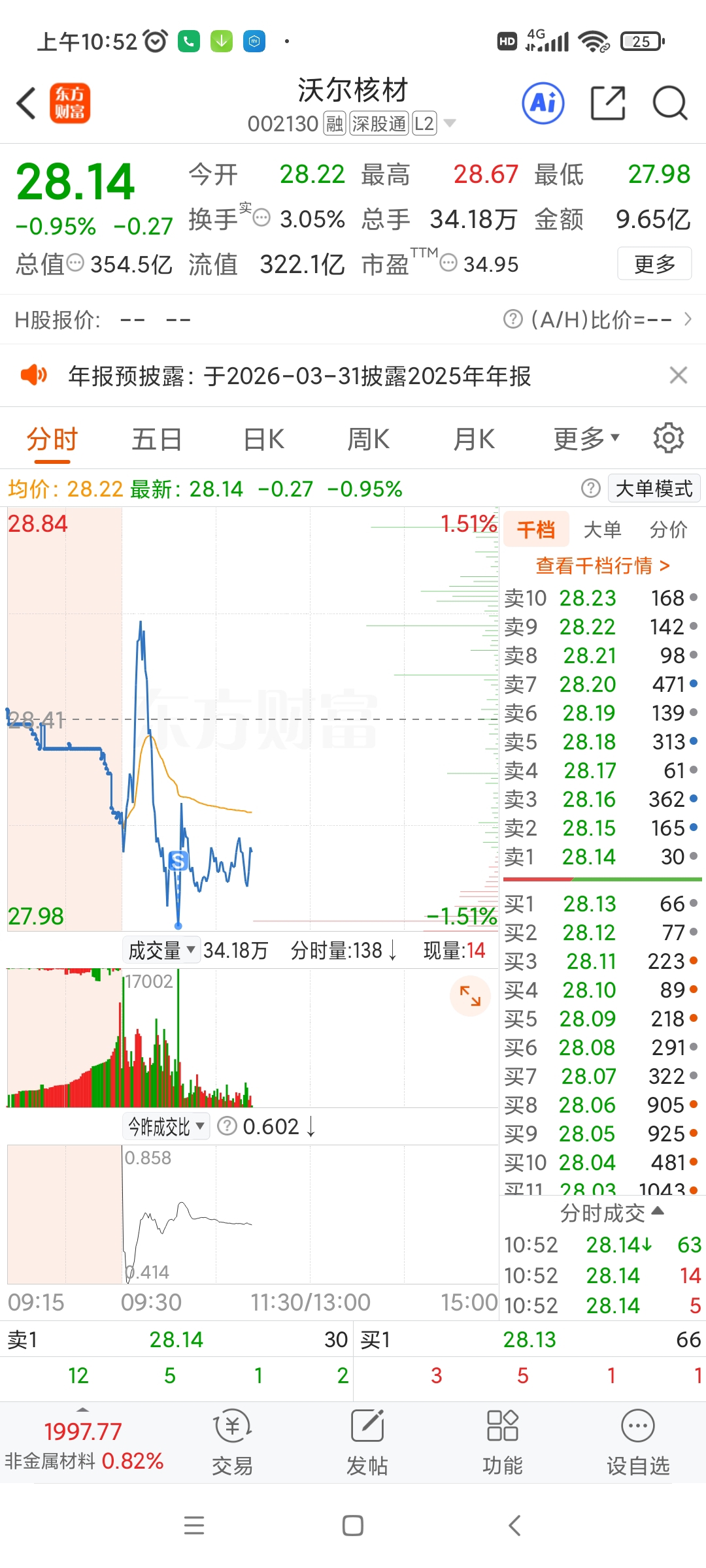 $沃尔核材(SZ002130)$ 我真厉害,一卖他又不跌了