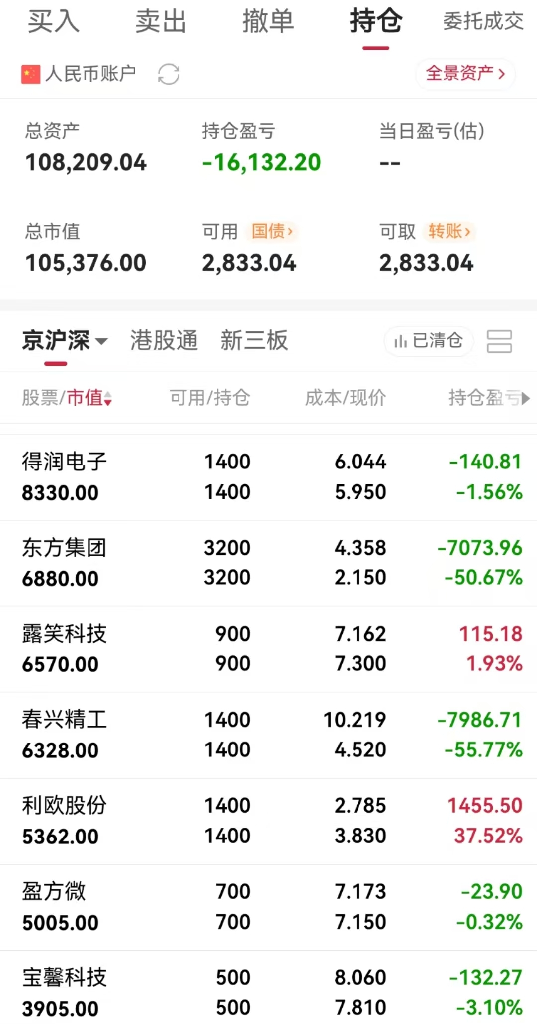 真是手臭,买啥亏啥,今天中百集团,利欧上了个厕所没卖,回来又亏了,唉。晚上我这些